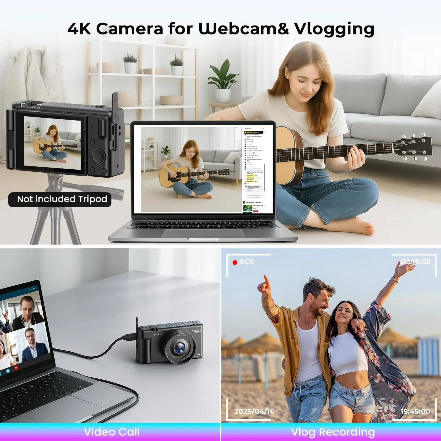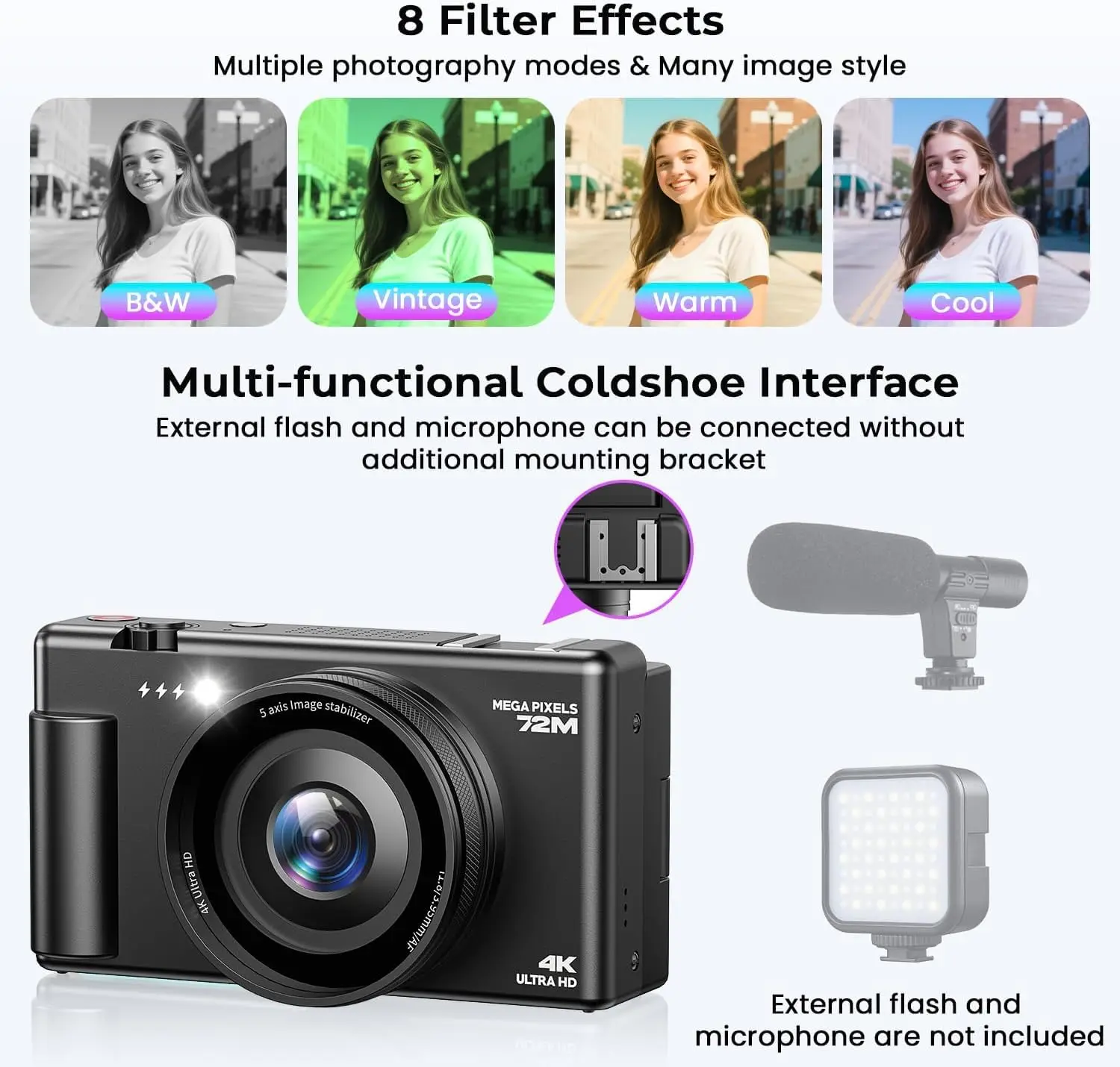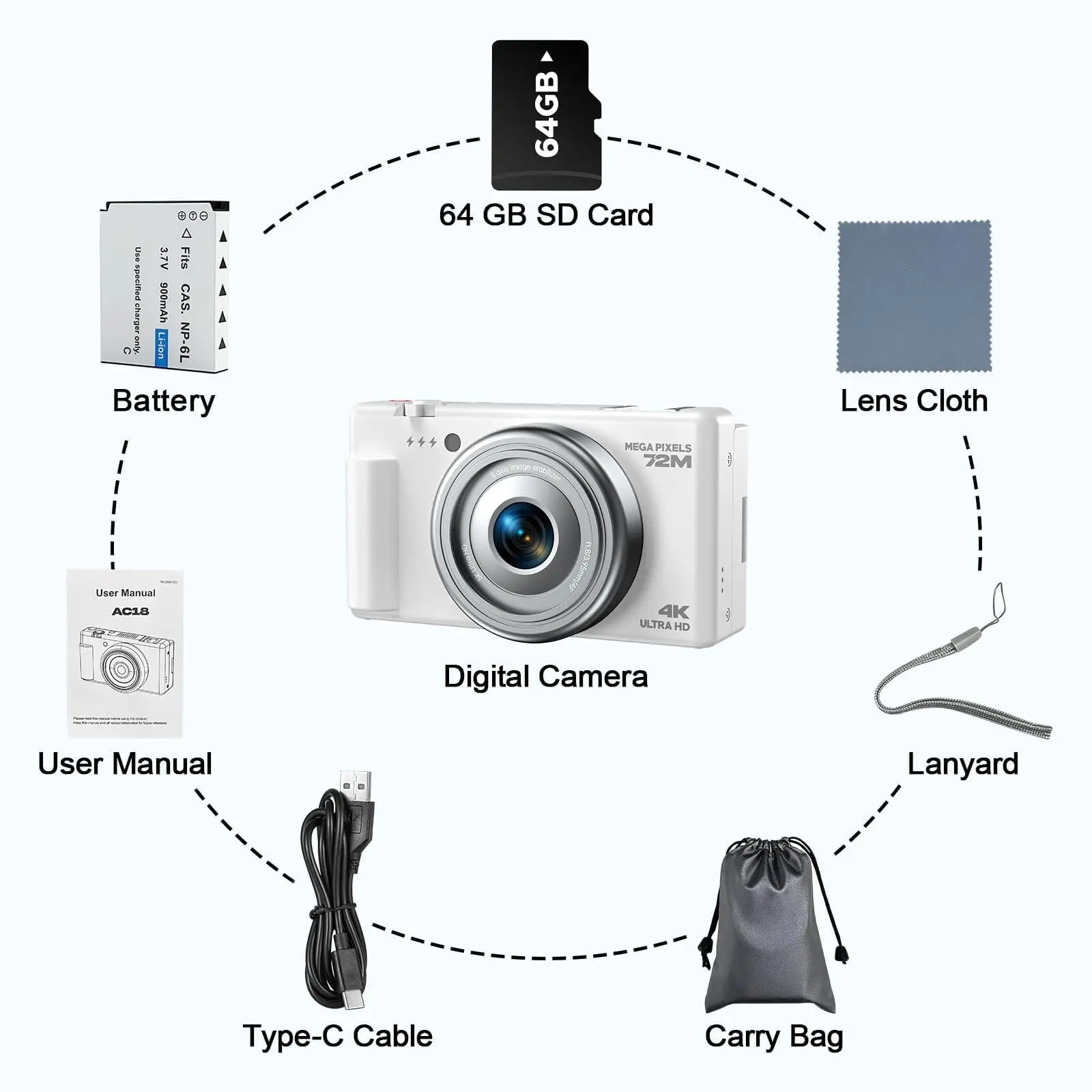 4K Digital Camera 72MP Autofocus Point and Shoot Cam with 12X Optical Zoom 3 Inch Flip Screen WiFi Vlogging Camera 2 Batteries