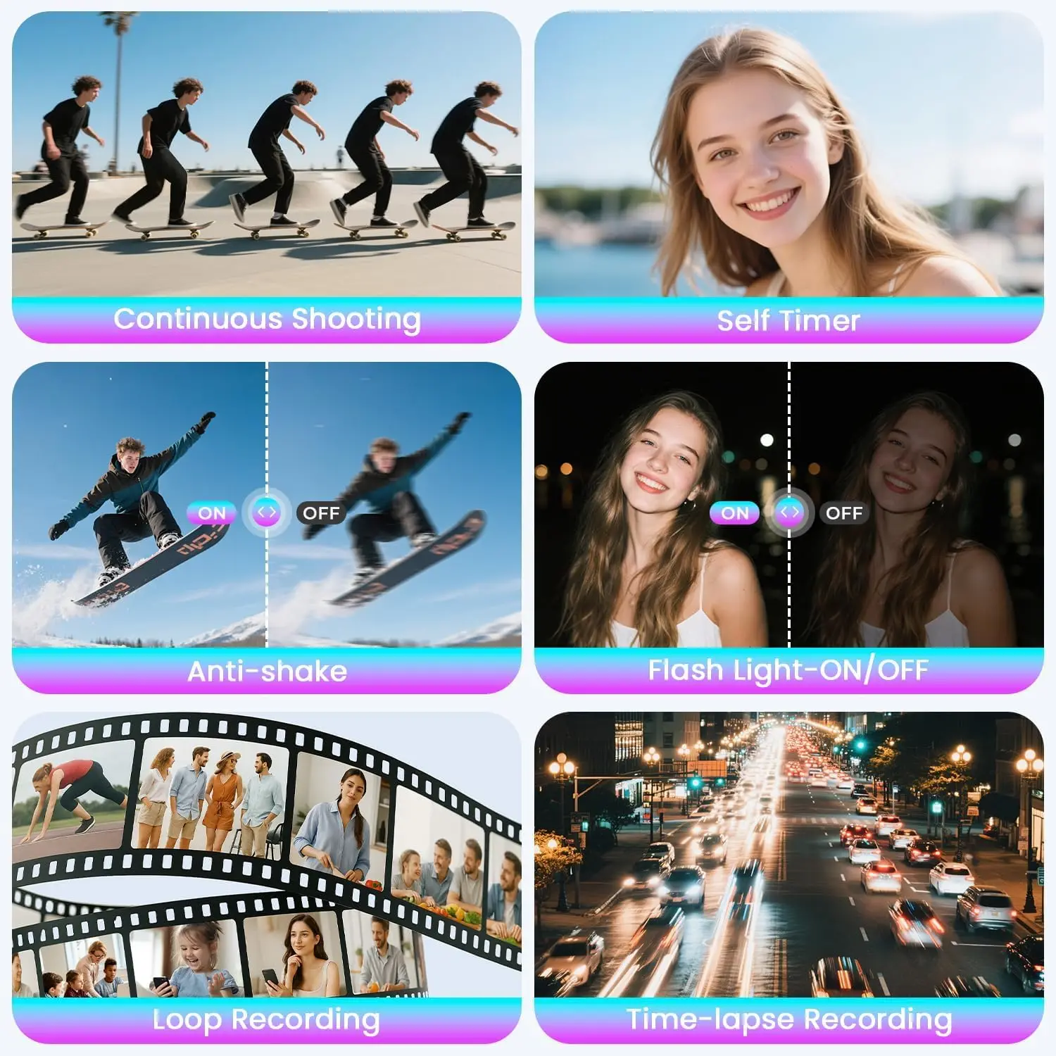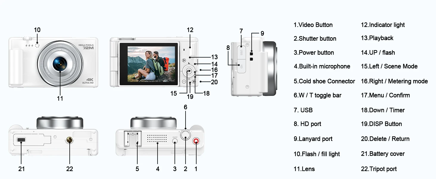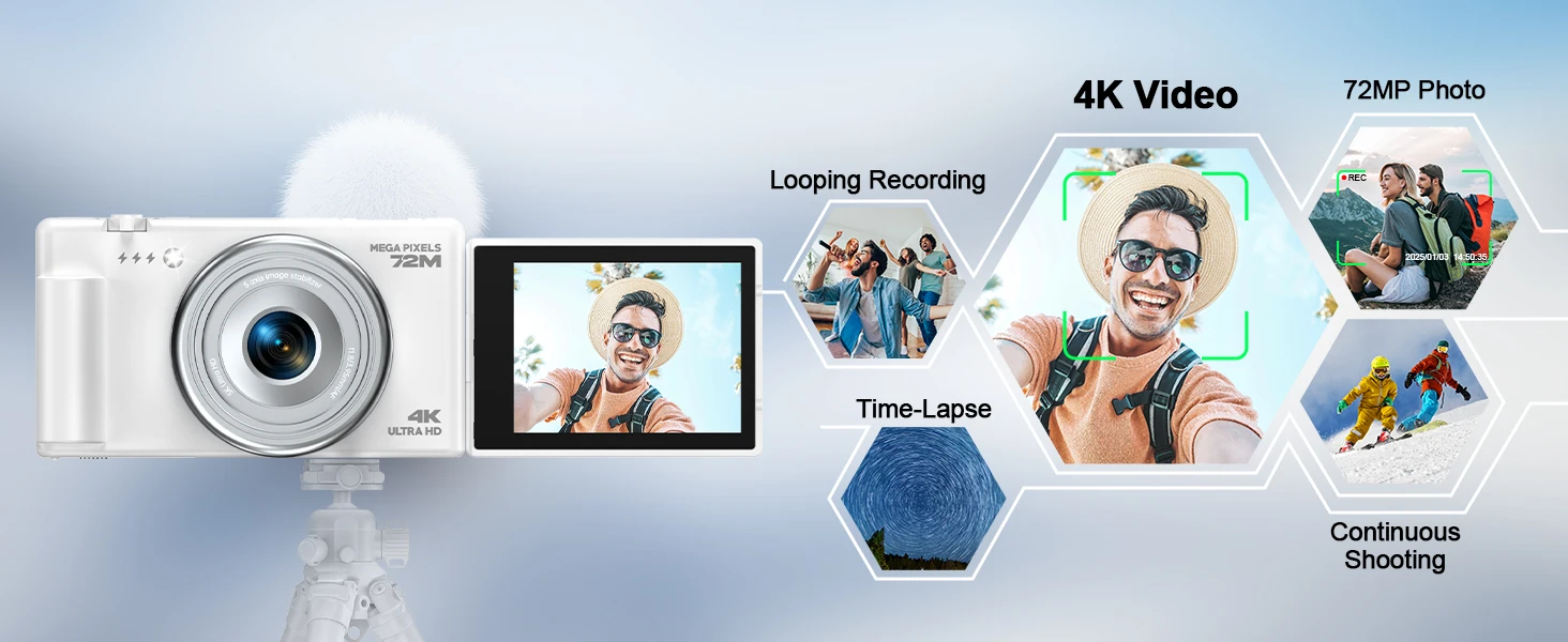 4K Digital Camera 72MP Autofocus Point and Shoot Cam with 12X Optical Zoom 3 Inch Flip Screen WiFi Vlogging Camera 2 Batteries