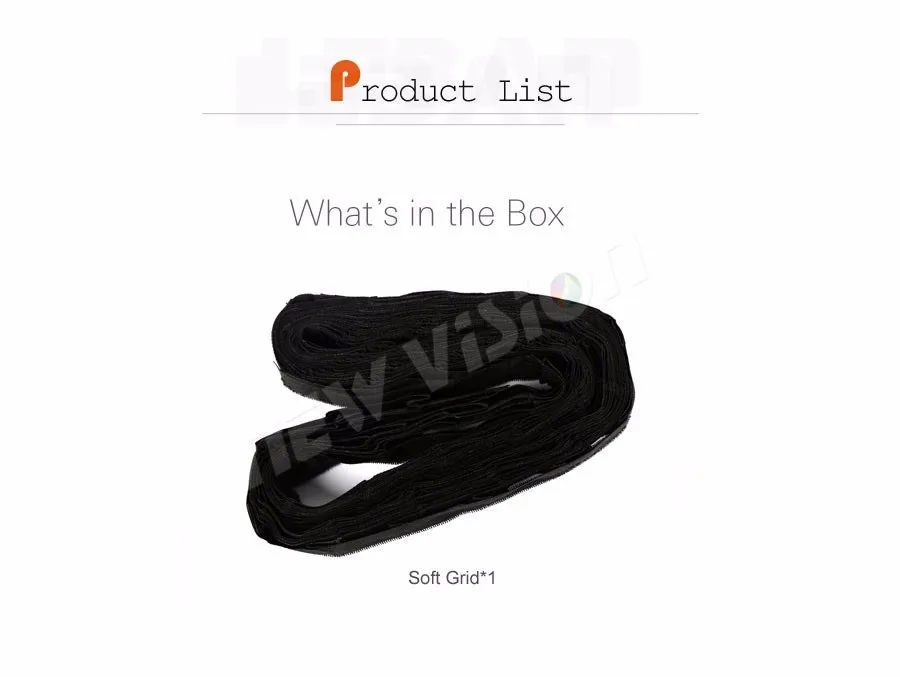 It's made of black special fabric, the weight is only about 80g; with honeycomb-style design, the length of each side is about 33mm. With Velcro sewn around the sides, can be respectively fastened to the inner side of the 60cm x 90cm/70x100cm/80x120cm umbrella softbox;