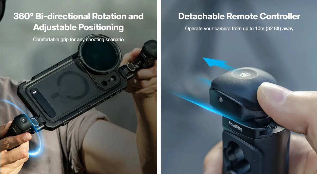 · Wireless Remote Control Shooting: The side handle comes with a detachable remote control that allows you to remotely control your phone to take photos or record videos from up to 10 meters away.