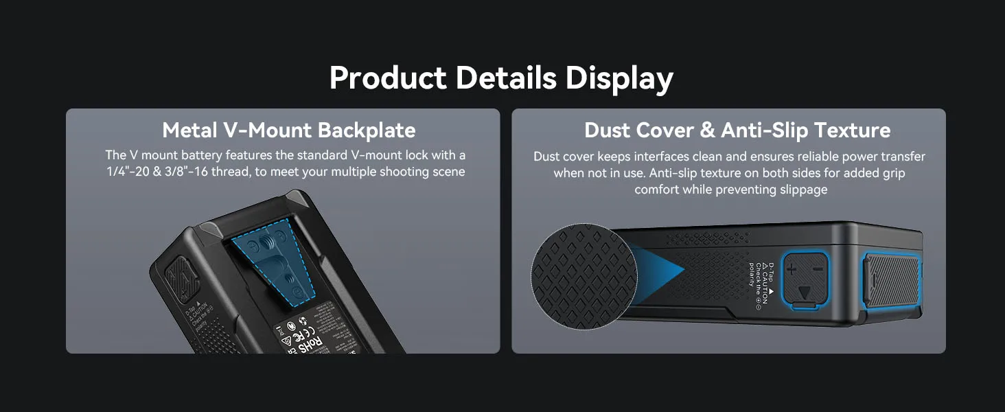 · Metal V-Mount Backplate: The V mount battery features the standard V-mount lock with a 1/4"-20 & 3/8"-16 thread, to meet your multiple shooting scene