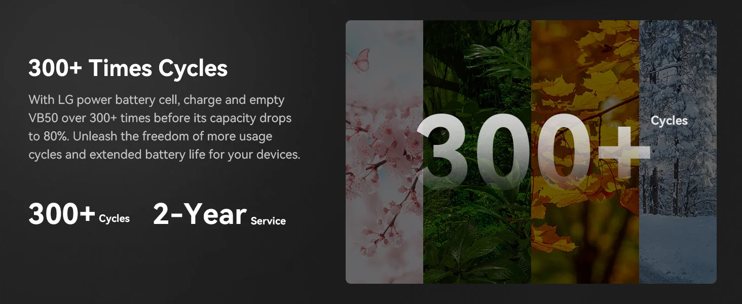 With LG power battery cell, charge and empty VB50 over 300+ times before its capacity drops to 80%. Unleash the freedom of more usage cycles and extended battery life for your devices