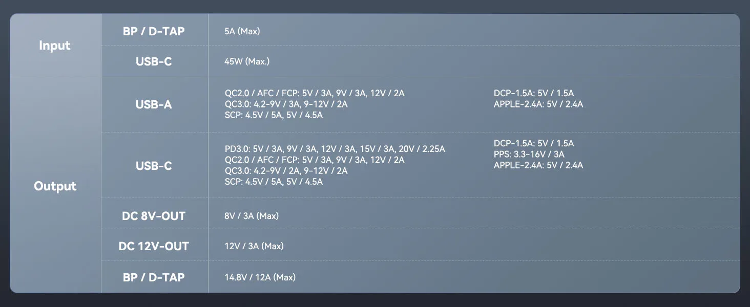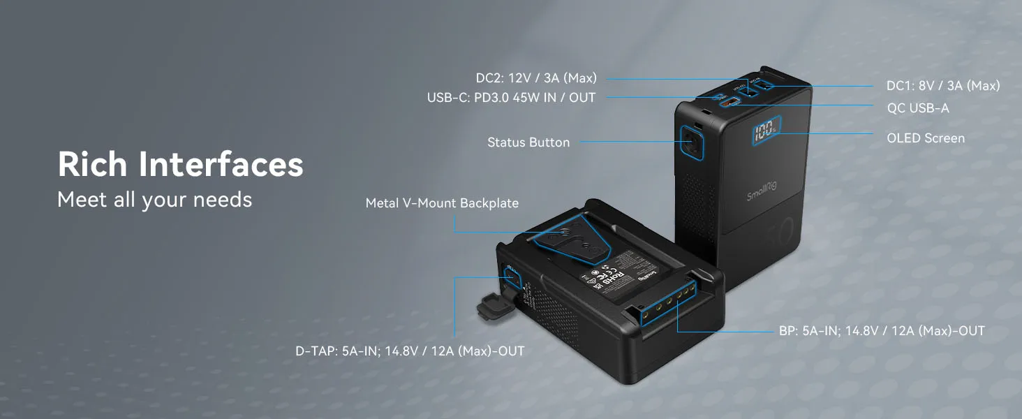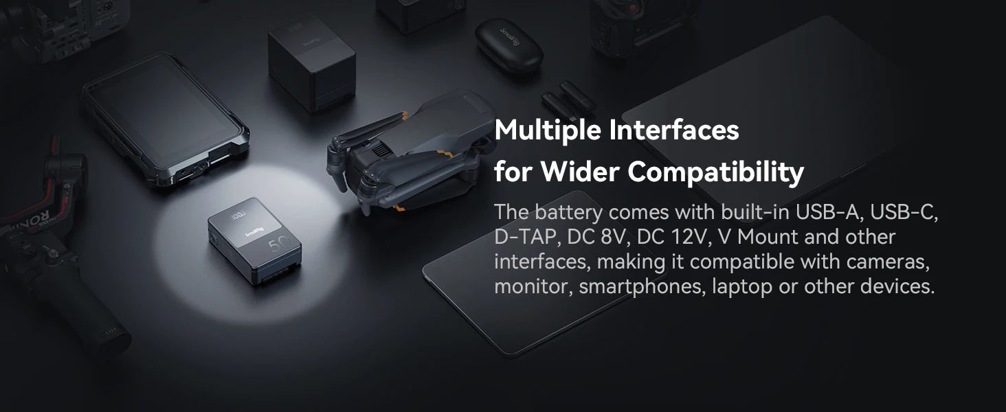 The battery comes with built-in USB-A, USB-C, D-TAP, DC 8V, DC 12V, V Mount and other interfaces, making it compatible with cameras, monitor, smartphones, laptop or other devices