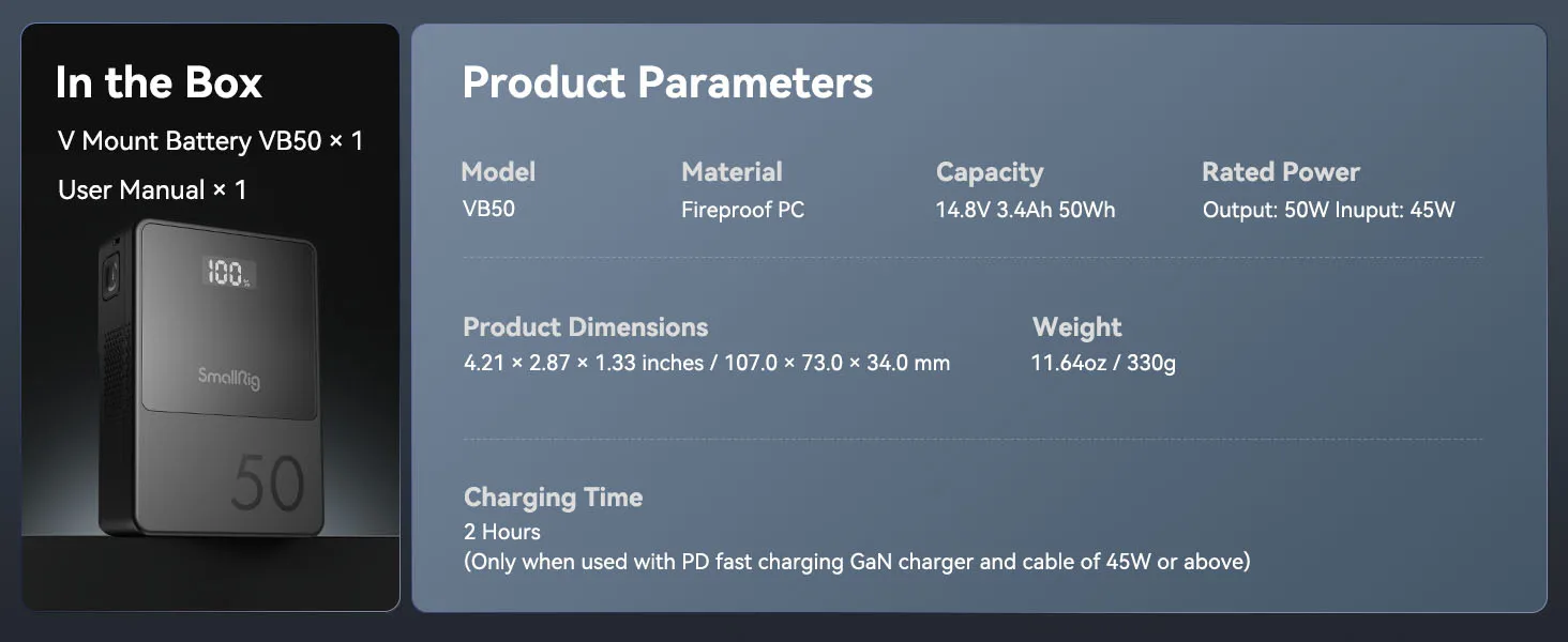 SmallRig VB50 50Wh / 3400mAh V Mount Battery