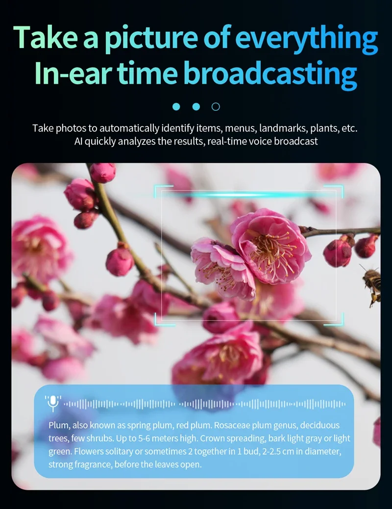 Main Features: AI voice assistant/photo taking/video recording/audio recording/music control/calling/alert sounds/indicator lights/translation/object recognition/touchscreen/music playback (music control, local music) etc.